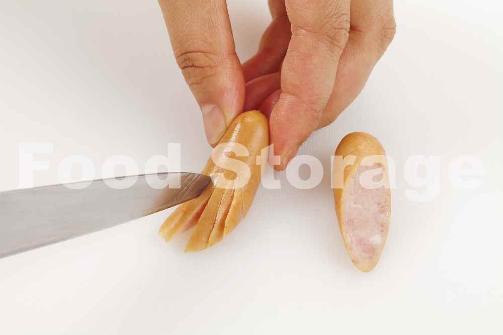 ウインナーは斜め半分に切り、それぞれ訪朝で8本の切り込みを入れる。