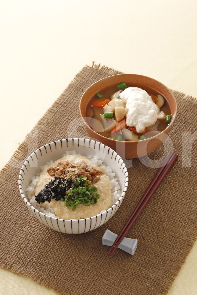 | 【献立】納豆とろろごまかけごはん+ほたてと野菜のとろろ汁 |