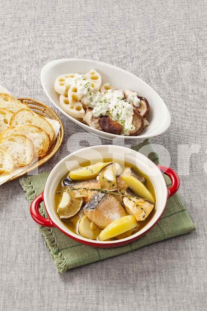 | 【献立】鮭とエリンギとポテトのアヒージョ+しいたけとれんこんのタルタル風ドレッシングがけ |