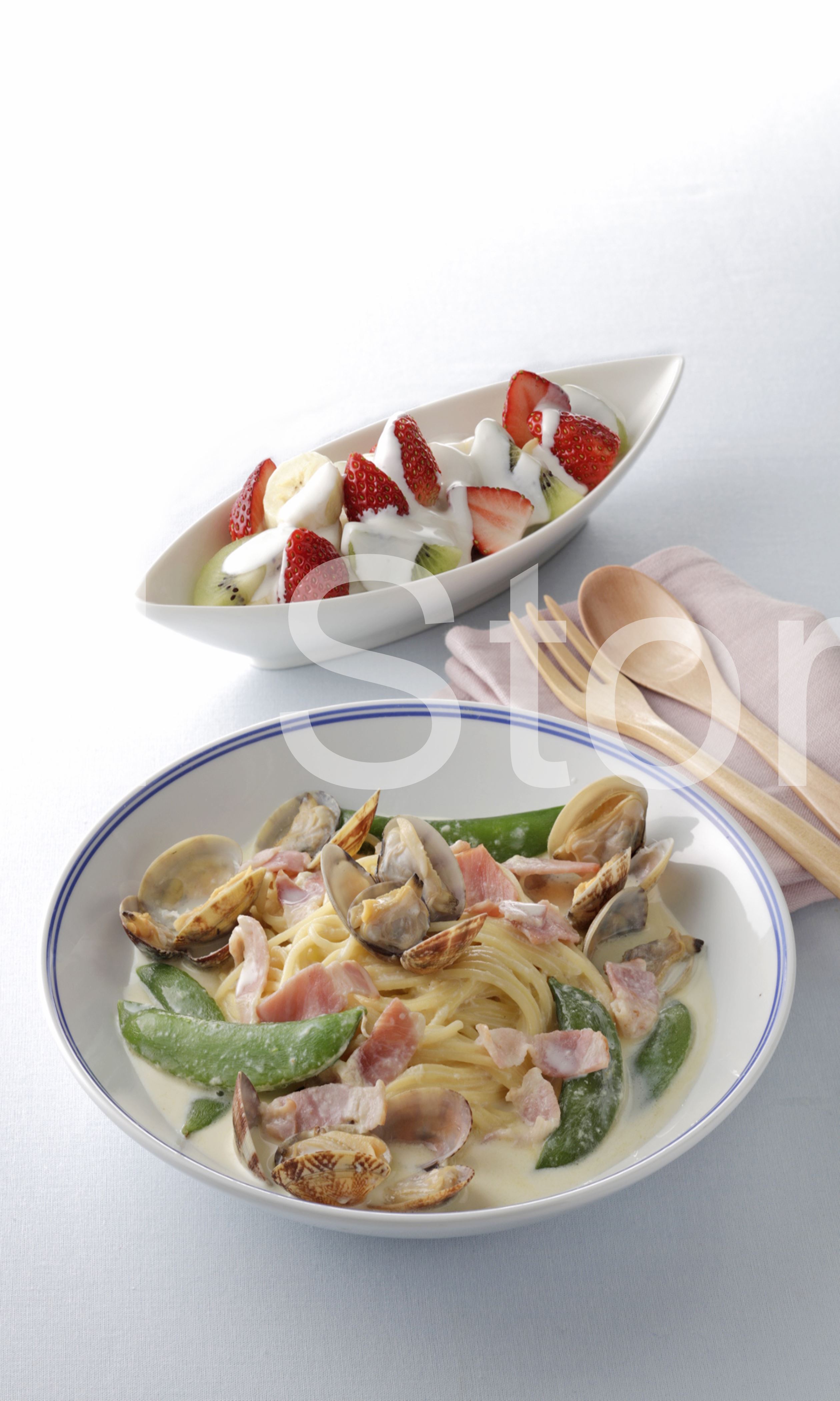 | 【献立】あさりとスナップエンドウの豆乳スープパスタ+フルーツヨーグルトサラダ |