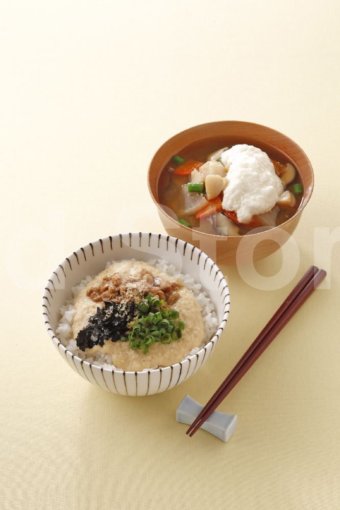 | 【献立】納豆とろろごまかけごはん+ほたてと野菜のとろろ汁 |