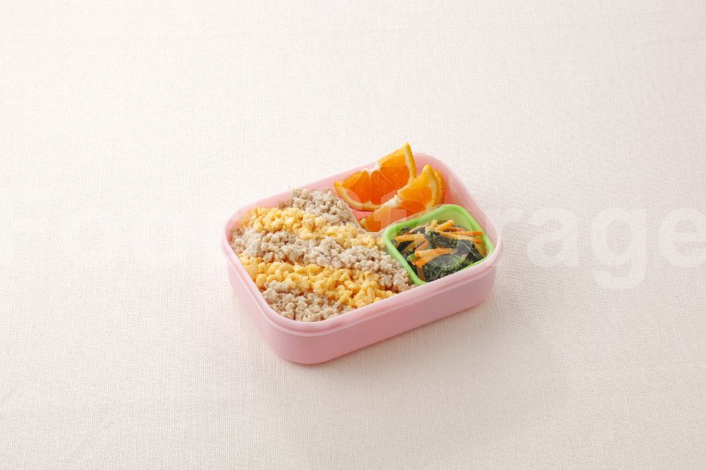 | 【お弁当】鶏ひき肉と卵のそぼろ丼+にんじんとほうれん草のごまマヨ炒め |
