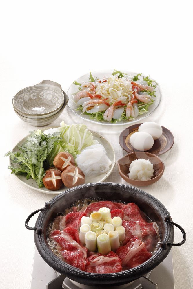 | 【献立】ねぎのぶつ切りすき焼き+いかと甘えびの海鮮ポン酢サラダ |