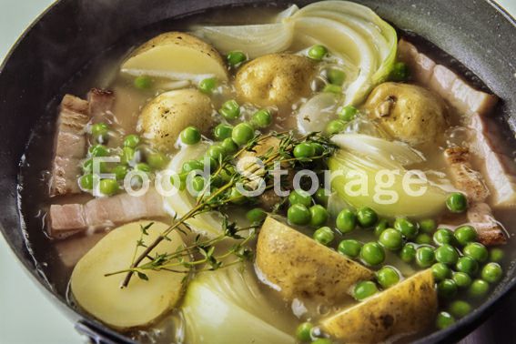 | 新じゃがとベーコン、えんどう豆のスープ煮 |