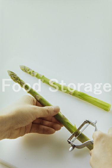 グリーンアスパラガスは、根元のかたい部分を取り除いて半分に切る。マッシュルームは軸を切り落とす。にんにくは薄切りにする。 |