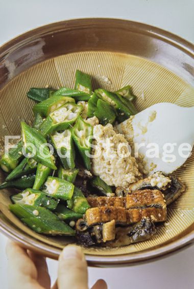 オクラは塩ゆでし、斜めに小口切りする。うなぎの蒲焼きは5mm幅に切る。