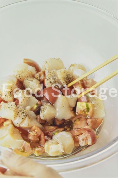 ほたて貝柱は4等分に、フルーツトマトは1.5cm角に切り、合わせたAであえる。 |