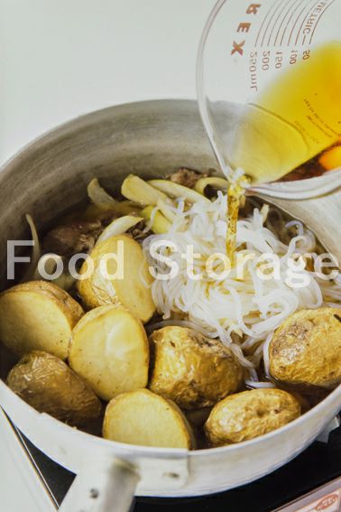 牛こま切れ肉 新じゃが 新玉ねぎ しらたき さやえんどう A(酒 みりん しょうゆ 砂糖 水) 揚げ油 サラダ油