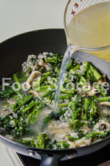 フライパンにオリーブ油を熱し、2の菜の花、マッシュルームを炒めて塩、こしょうし、米を洗わないで、加えて油が全体に回るまで炒め合わせる。 |