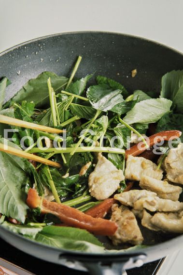 フライパンにサラダ油を熱し、弱火でしょうがを炒め、香りが出たら豚肉を炒める。 |