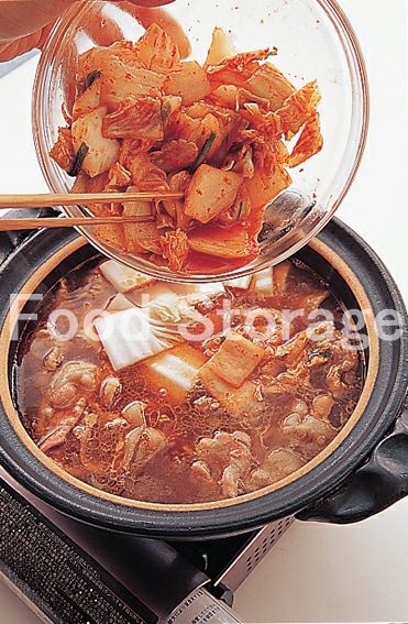 白菜の芯と白菜キムチを汁ごと加え、少し煮る。 |