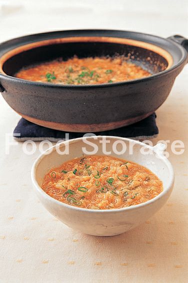 鍋に残った煮汁を再び温め、たらこをほぐして加え、ご飯を加えて煮る。ご飯がふっくらと煮えたら卵を溶きほぐして回し入れ、小ねぎの小口切りを散らしてふたをして少し蒸らす。 |
