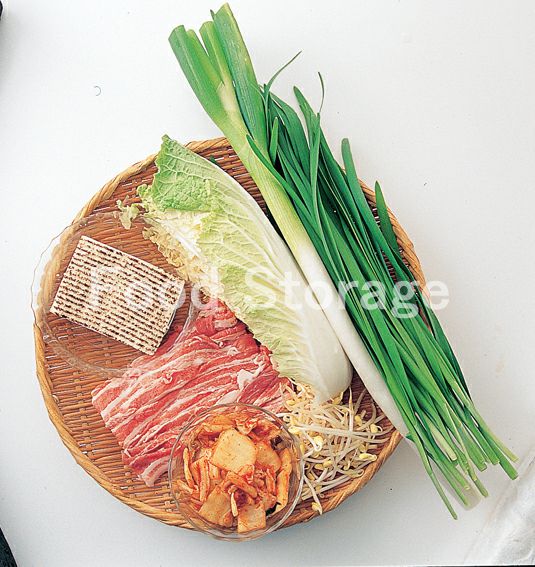 豚肉は3等分に切る。白菜、にら、白菜キムチはざく切りにする。長ねぎは斜め切りに、焼き豆腐はひと口大に切る。 |
