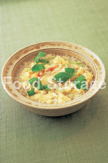 残った煮汁を温め、さっと水洗いいしたご飯と焼いた切り餅を加えてかるく煮る。塩を加えて味を調え、卵を溶きほぐして回し入れ、半熟状になったらざく切りにした三つ葉を散らす。 |