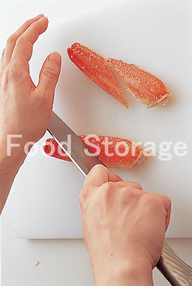 かに足は、切り口を斜めに広く切って食べやすくする。つめは、はさみで切り込みを入れておく。 |