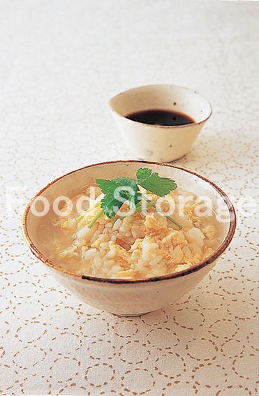 残った煮汁を塩で味を調え、水洗いしたご飯を加えて煮る。煮立ったら卵を溶き入れ、刻んだみつ葉を散らして火を止める。卵が半熟になったら器に盛り、ポン酢しょうゆをかけていただく。 |