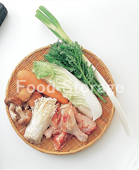 鶏骨付きブツ切り肉 白菜 長ねぎ にんじん しいたけ えのきだけ) 春菊 水 酒 たれ(ポン酢しょうゆ) 薬味(万能ねぎ(小口切り)・もみじおろし)