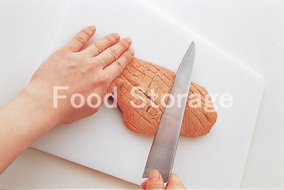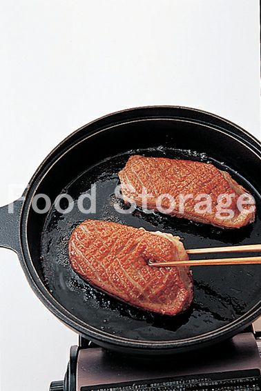 鉄鍋を熱し、3の皮目を下にして入れ、両面を焼いて余分な脂を落とす。粗熱がとれたら、5mm幅の薄切りにする。 |