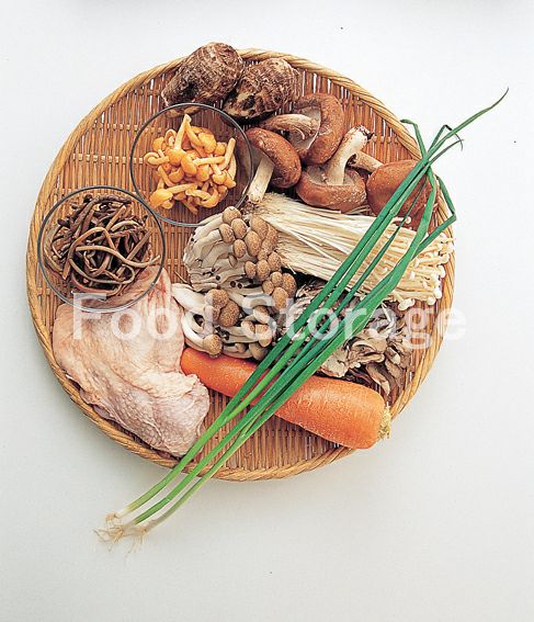 A(しいたけ しめじ) まいたけ) えのきだけ) なめこ) 鶏もも肉 里いも にんじん ぜんまい(水煮) 万能ねぎ B(だし汁 みりん・しょうゆ 酒 塩) 七味唐辛子