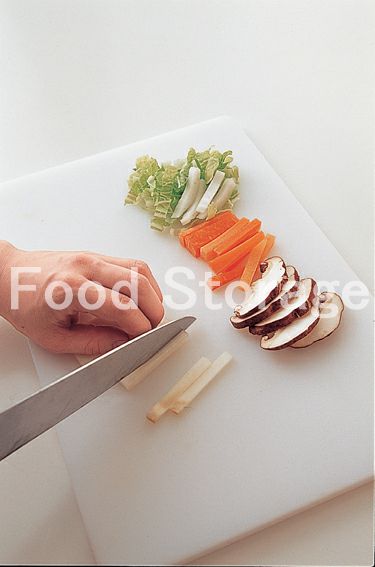 白菜は5mm幅の細切り、にんじん、うどは皮をむき、同様に細切りにする。しいたけは軸を切り落とし5mm幅の細切りにし、えのきだけは石づきを切り落として半分に切り、ごぼうはささがきにして水にさらし、みつ葉はざく切りにする。 |