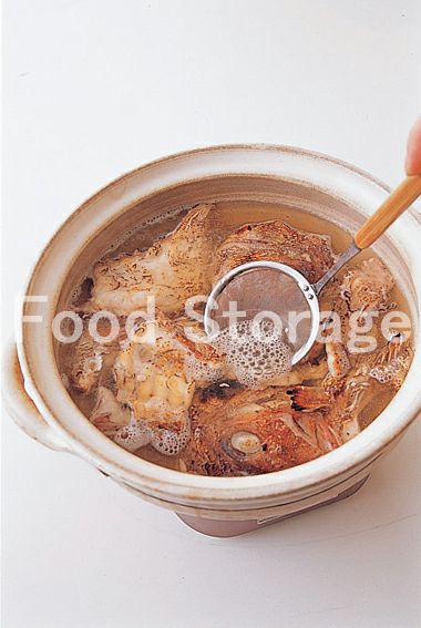 鍋にAと1のあぶった鯛の頭と骨を入れて煮立たせてアクを取り、塩で味を調える。 |