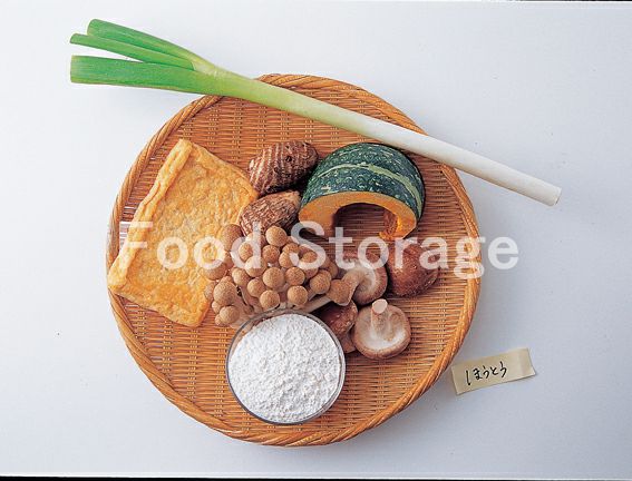 強力粉、薄力粉 塩 水 かぼちゃ 里いも 長ねぎ しいたけ しめじ) 油揚げ 煮干しだし 砂糖 みそ