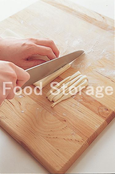 打ち粉をふり、2を麺棒で2〜3mm厚さになるまで伸ばし、全体に打ち粉をして折りたたむ。包丁で7〜8mm幅に切って、くっつかないように打ち粉をたっぷりとまぶす。 |
