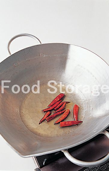 鍋にサラダ油、赤唐辛子を入れて弱火にかけ、香りが出てきたら、いったん赤唐辛子を取り出す。 |