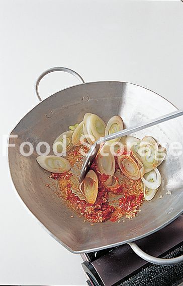 長ねぎは斜め薄切りにし、にんにく、しょうがはみじん切りにする。赤唐辛子は種を取り除く。 |