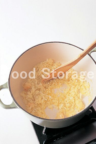 鍋にオリーブ油、にんにくを入れて弱火にかけ、香りが出たら、玉ねぎ、セロリを加えて炒める。 |