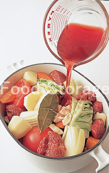 牛バラ肉(シチュー用) じゃがいも にんじん 玉ねぎ セロリ トマト キャベツ にんにく ビーツのスライス(缶詰) A(ビーフブイヨン ローリエ ビーツの缶詰の汁) はちみつ 塩 こしょう サワークリーム