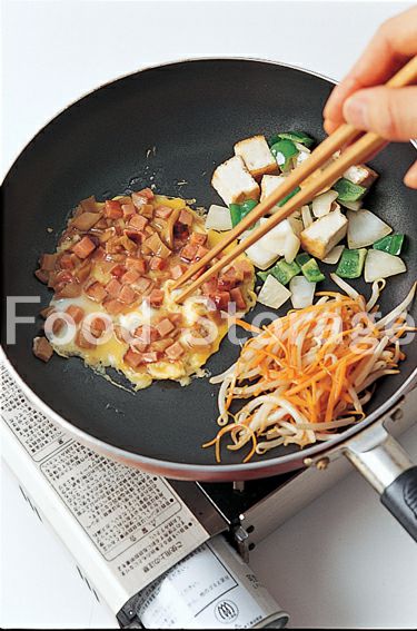 2.フライパンを火にかけ、ごま油を熱し、切った材料を入れて炒める。 3.合わせたAを加えて炒め合わせる。 |