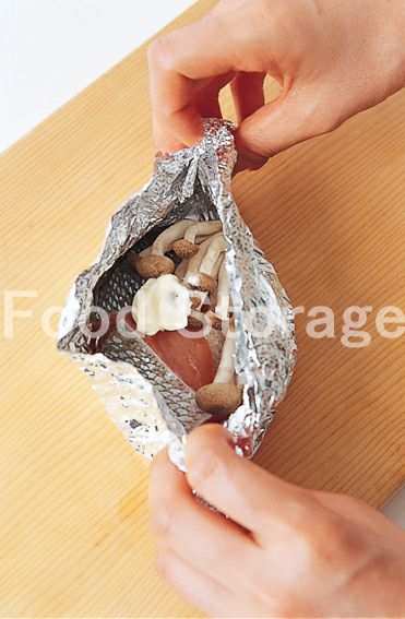 2.水けを拭いた鮭に酒をふってアルミホイルにのせ、しめじ、バターを上にのせて全体を包む。