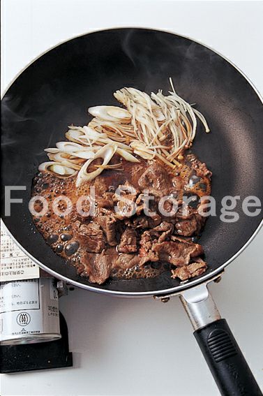 2.フライパンを火にかけ、サラダ油を熱し、牛肉、長ねぎ、えのきだけを炒める。