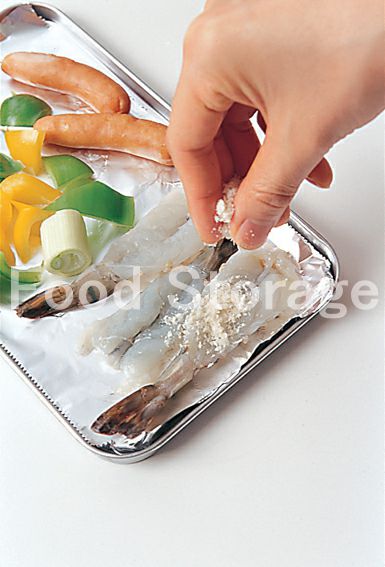 2.えびの開いた面を上にしてアルミホイルの上に並べ、合わせたAを散らしてオリーブ油をかける。