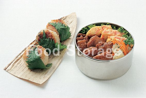 1.炊き込みごはんを丸形に握る。 2.合わせたAを塗り、フライパンでこんがりと焼く。 3.仕上げに青じそを巻く。 |