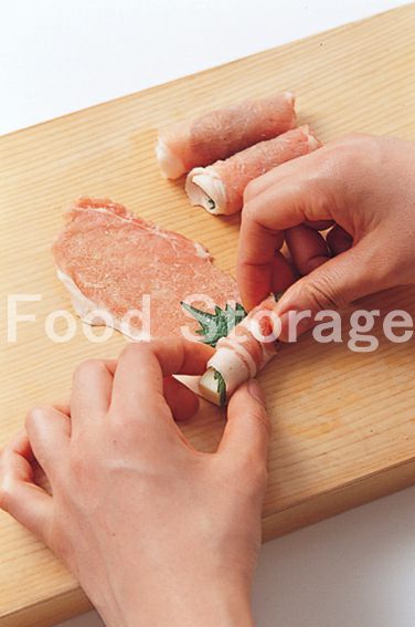 豚薄切り肉は広げて塩、こしょうをふり、青じそを1枚、その上にプロセスチーズを1本のせて手前からきっちりと巻く。同様にもう2個巻く。 |