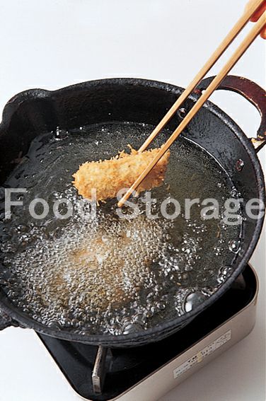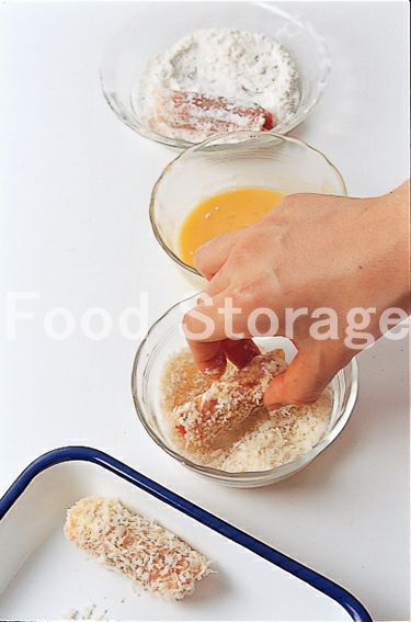 薄力粉、溶き卵、パン粉の順に衣をつる。 |