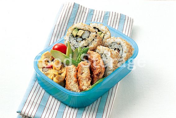 1.えびは背わたを取って殻をむき、腹側に包丁を入れて曲がらないようにしておく。アボカドは7?8mm角の棒状に切り、貝割れ大根は根元を切り落とす。 2.温かいごはんに合わせたAを混ぜ、すし飯を作る。 3.えびは塩、酒各少々(分量外)を加えた湯でゆでる。 4.のりを縦長に置き、2のすし飯を全体に広げてのせる。すし飯を下にしてラップの上に置く。 5.4に3のえび、アボカド、貝割れ大根をのせてマヨネーズを絞り、手前からす巻きの要領で巻く。 6.まわりにごまをつけ、食べやすく切ってお弁当箱に詰める。隙間にプチトマト(分量外)を添える。 |