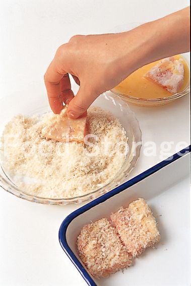 1の豚肉に薄力粉、溶き卵、パン粉の順に衣をつける。 |