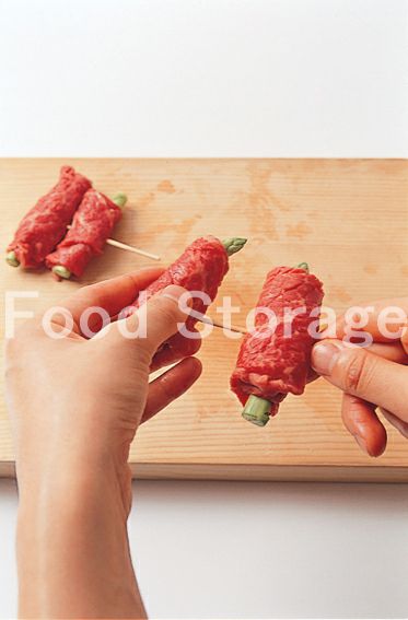 牛肉を広げ、切ったグリーンアスパラガスを2本のせて巻く。同様に3個巻く。 |