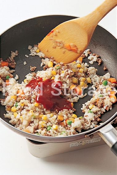 玉ねぎ ミックスベジタブル(冷凍) 牛ひき肉 サラダ油 塩 こしょう ごはん A(トマトケチャップ 中濃ソース) サラダ油 溶き卵 トマトケチャップ