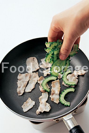 フライパンを火にかけ、サラダ油を熱し、豚肉を炒める。色が変わったら、ゴーヤーともやしを入れて炒める。 |