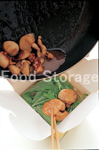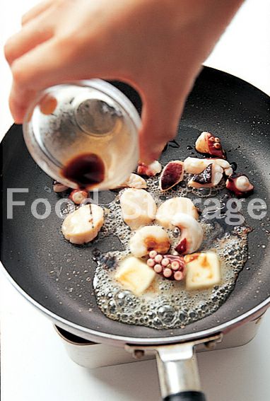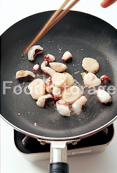 フライパンを弱火にかけ、オリーブ油とにんにくを入れてにんにくの香りがしたらにんにくを取り出す。そこへ.ゆでだことほたて、長ねぎを入れて炒め合わせる。 |