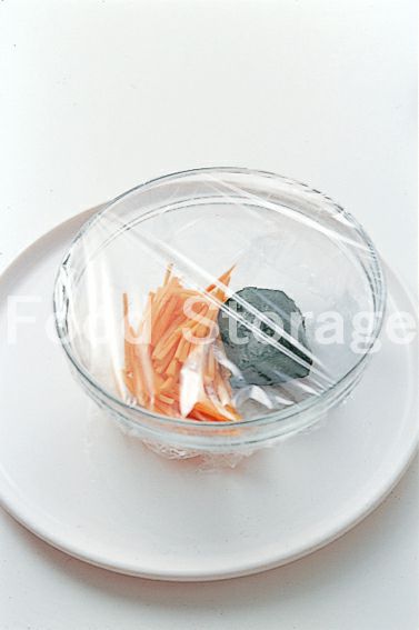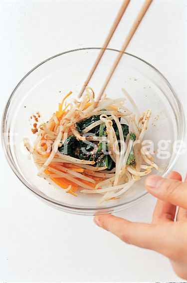 ナムルを作る。にんじん、ほうれん草を一緒に耐熱容器に入れ、ラップをして電子レンジで1分加熱し、もやしを加えてさらに1分加熱する。 |