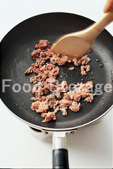 フライパンにサラダ油を熱し、ひき肉を炒める。 |