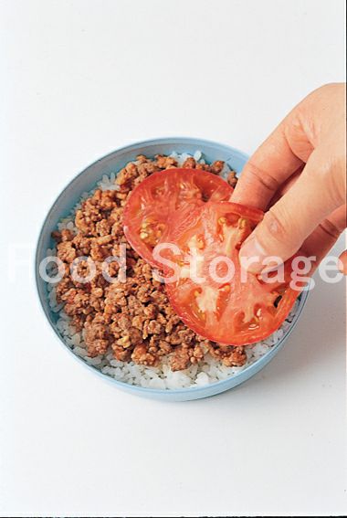ごはんの上に3を盛り、その上にトマトをのせる。 |