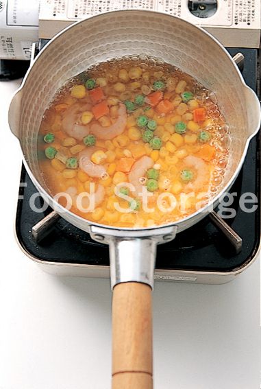鍋にAを煮立て、ミックスベジタブル、むきえびを加えて汁けがなくなるまで煮る。