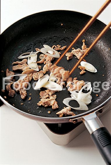 肉に火が通ったら、長ねぎとザーサイを入れてしんなりするまで炒める。 |