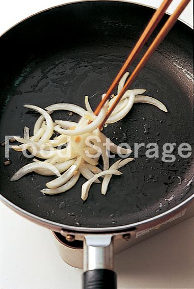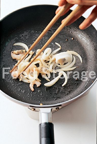 フライパンを火にかけごま油を熱し、しょうがと玉ねぎを炒める。 |